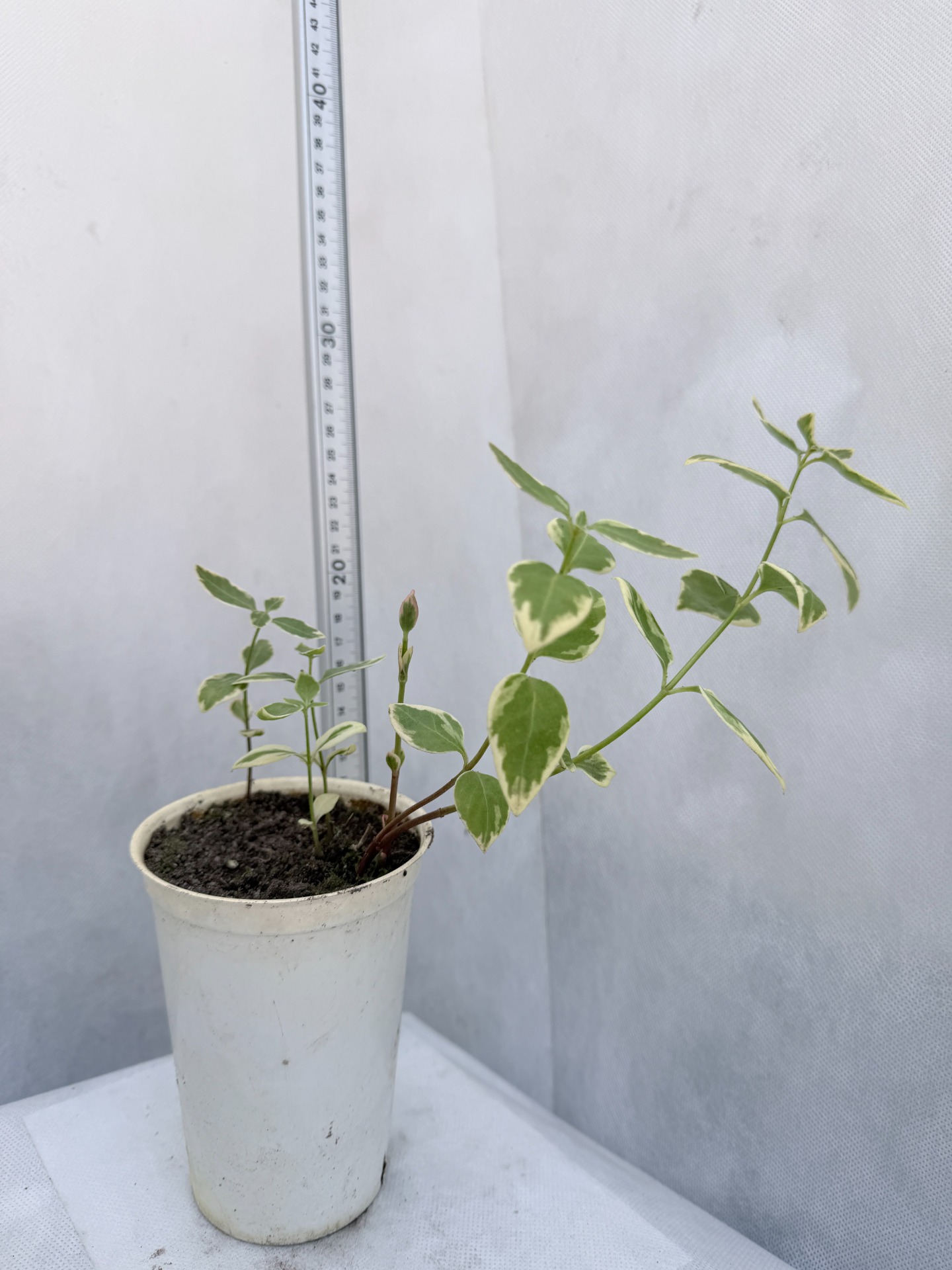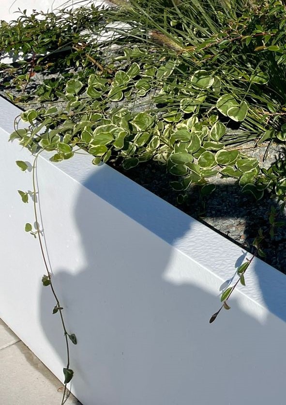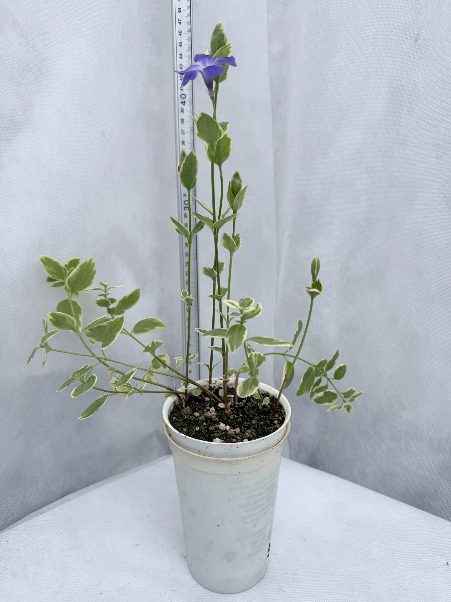 Vinca major 'Variegata' (Barvínek větší) je stálezelená půdopokryvná trvalka ceněná pro své dekorativní listy s krémově bílým lemováním a modrofialové květy. Je to robustnější a rychleji rostoucí příbuzný běžného barvínku menšího, ideální pro zpevnění svahů nebo jako převislá rostlina v nádobách. Vykvétá hlavně v květnu a červnu, ale jednotlivě se mohou květy objevovat až do září. Dosahuje výšky cca 30 cm, ale svými plazivými lodyhami se dokáže rozrůst do šířky několika metrů. Výhony při kontaktu s půdou rychle zakořeňují. Nejlépe prosperuje v polostínu až stínu. Na přímém slunci sice více kvete, ale vyžaduje pravidelnou zálivku, aby listy nezasychaly. Snese i horší kamenité půdy. Je mrazuvzdorný, avšak v tuhých zimách bez sněhové pokrývky mohou nadzemní části namrznout. Oproti barvínku menšímu (Vinca minor) je o něco citlivější. Rychle vytváří souvislý koberec, který účinně potlačuje plevel, brání erozi. Oblíbená jako převislá rostlina, kde její dlouhé šlahouny visí přes okraje květináčů nebo závěsných košů. V zahradě je třeba jeho růst usměrňovat, aby nepohltil menší trvalky.
